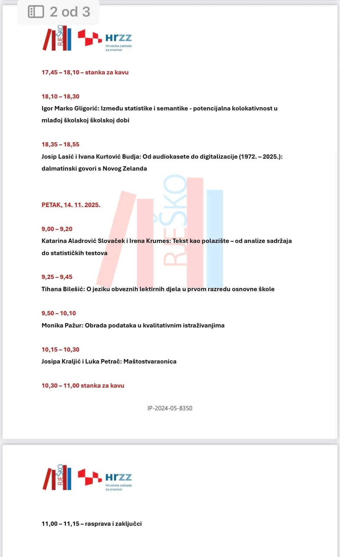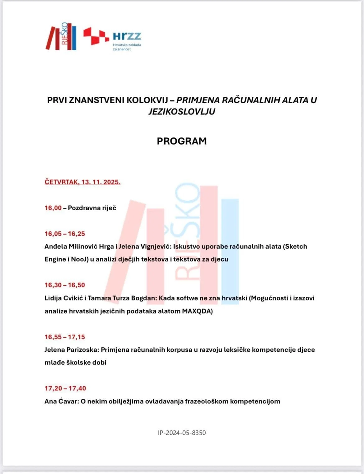 U četvrtak, 13.11. i petak, 14.11. uspješno je održan Prvi znanstveni kolokvij Primjena računalnih alata u jezikoslovlju na projektu RjeŠko. Hvala svima koji su svojim izlaganjima i sudjelovanjem u raspravi doprinijeli njegovu održavanju. Ujedno, to je jedna od posljednjih aktivnosti u prvoj projektnoj godini. Sada je vrijeme za analizu rezultata i pripremu novih projektnih aktivnosti.